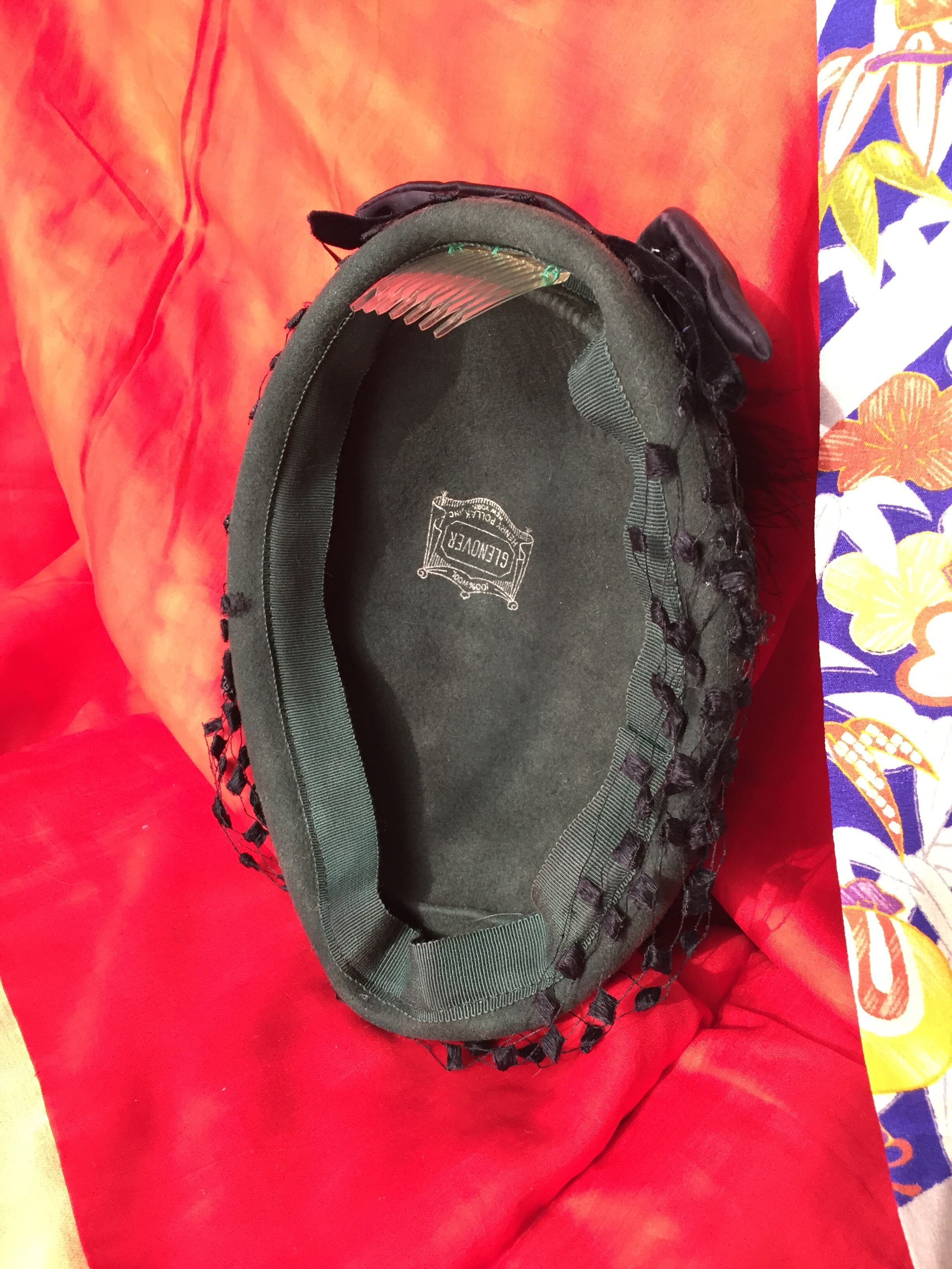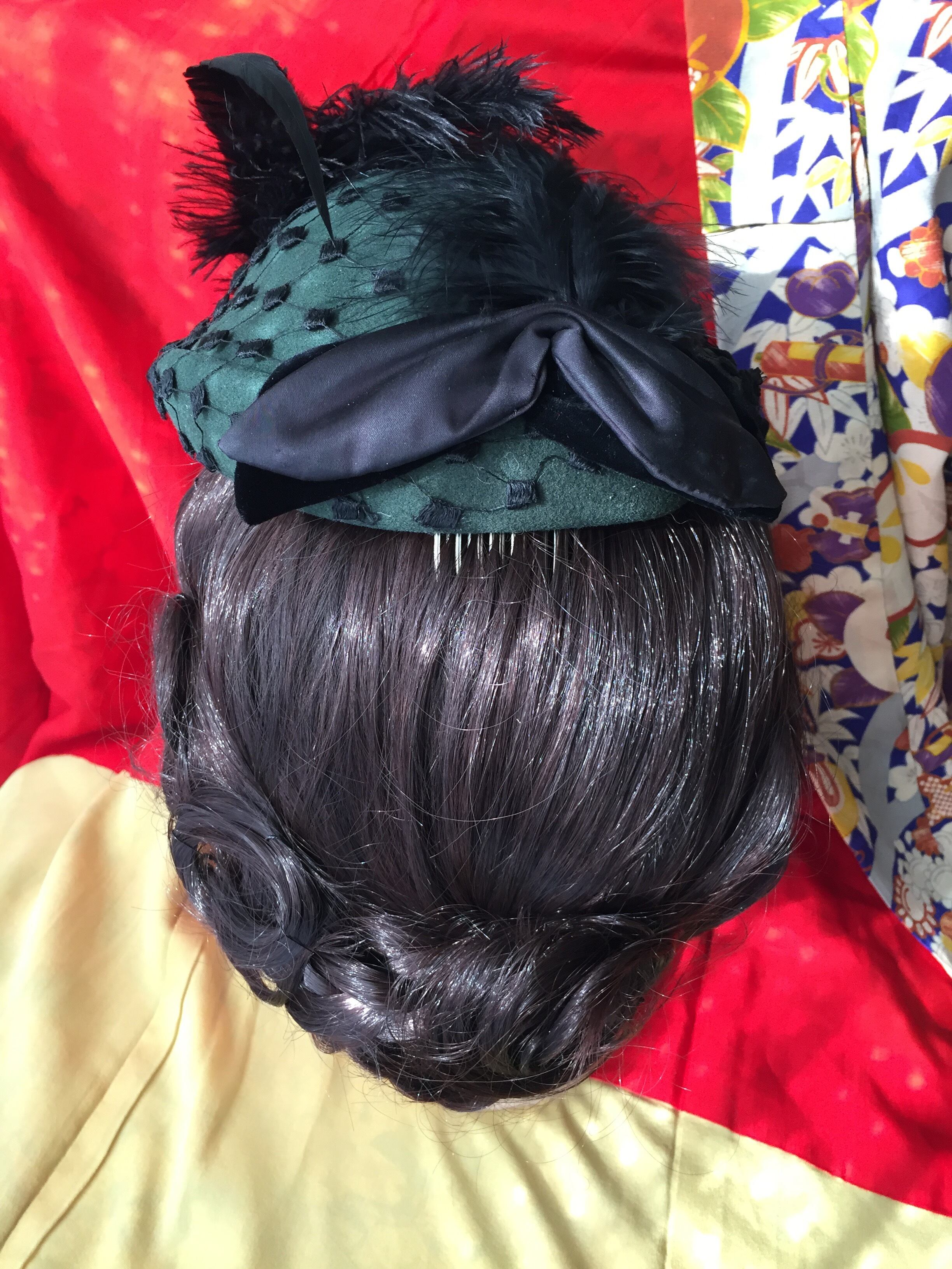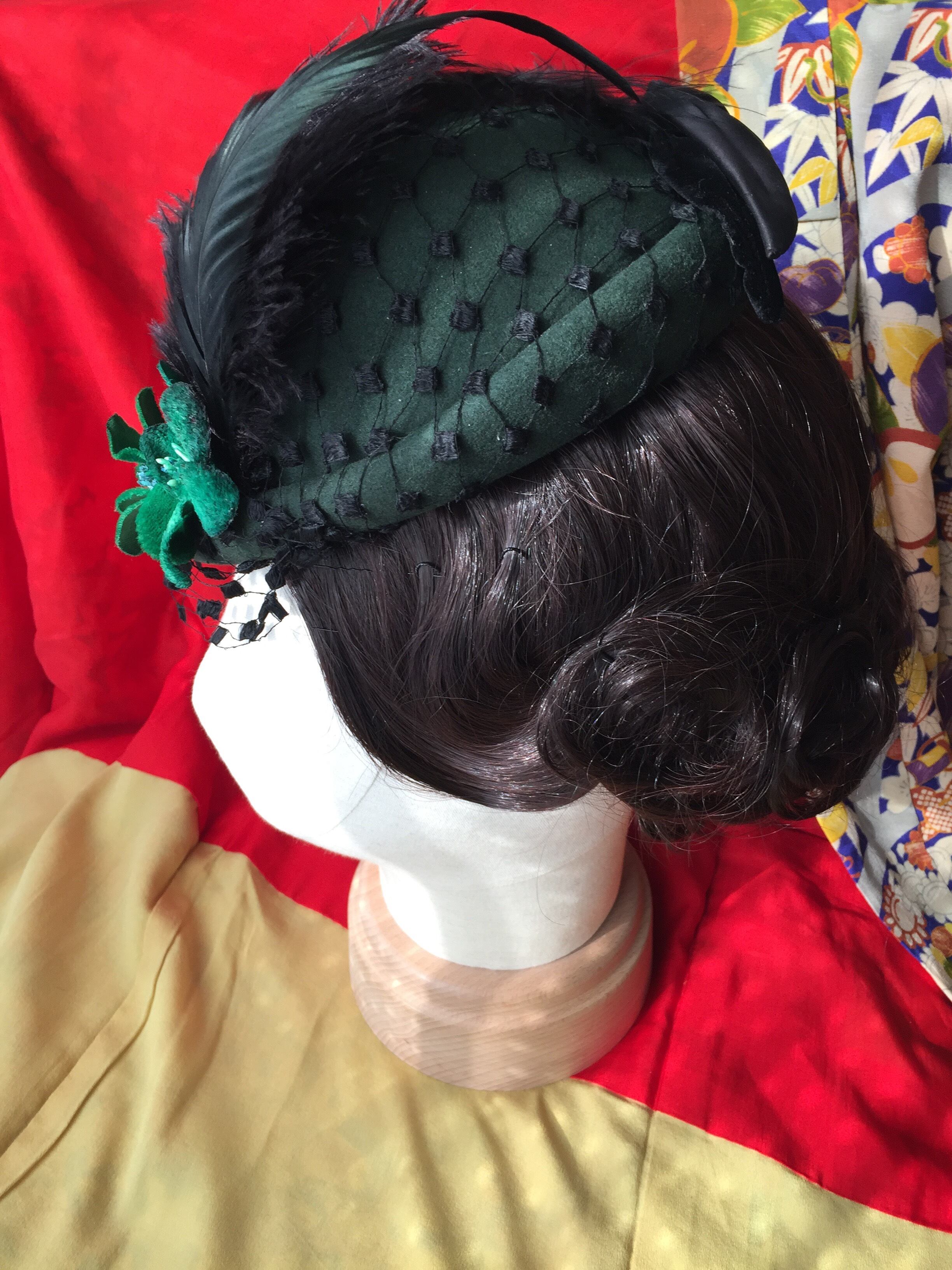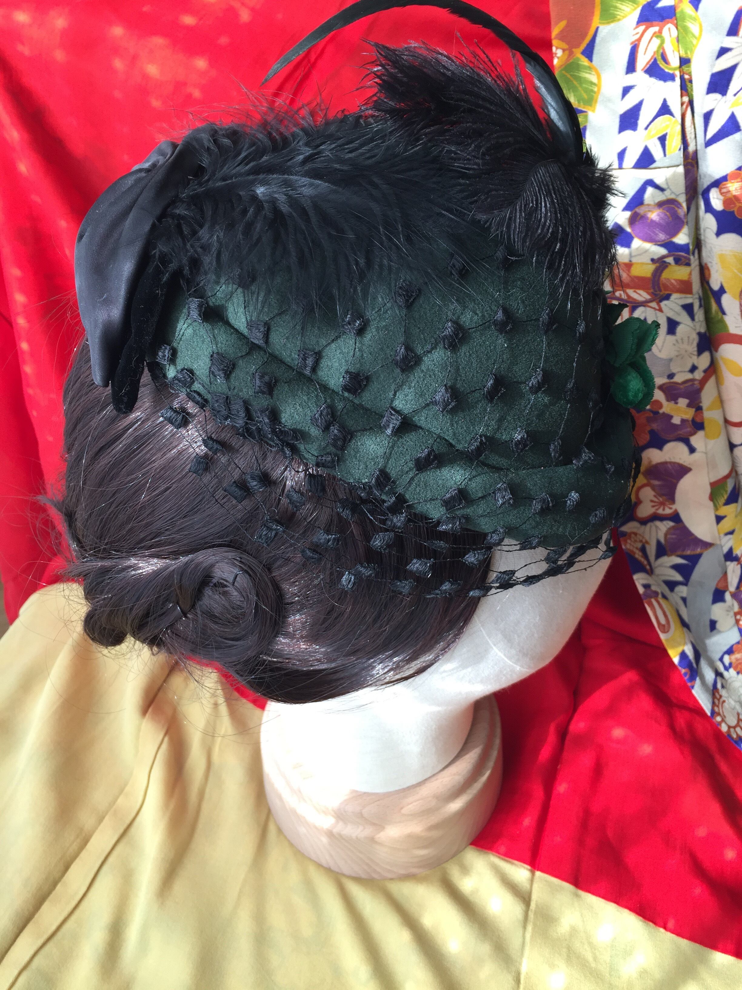 深いグリーンのボディーに、目の粗いネット、3 種類の黒いフェザー、後ろのダブルリボン、それらを二輪のお花がまとめ上げています。