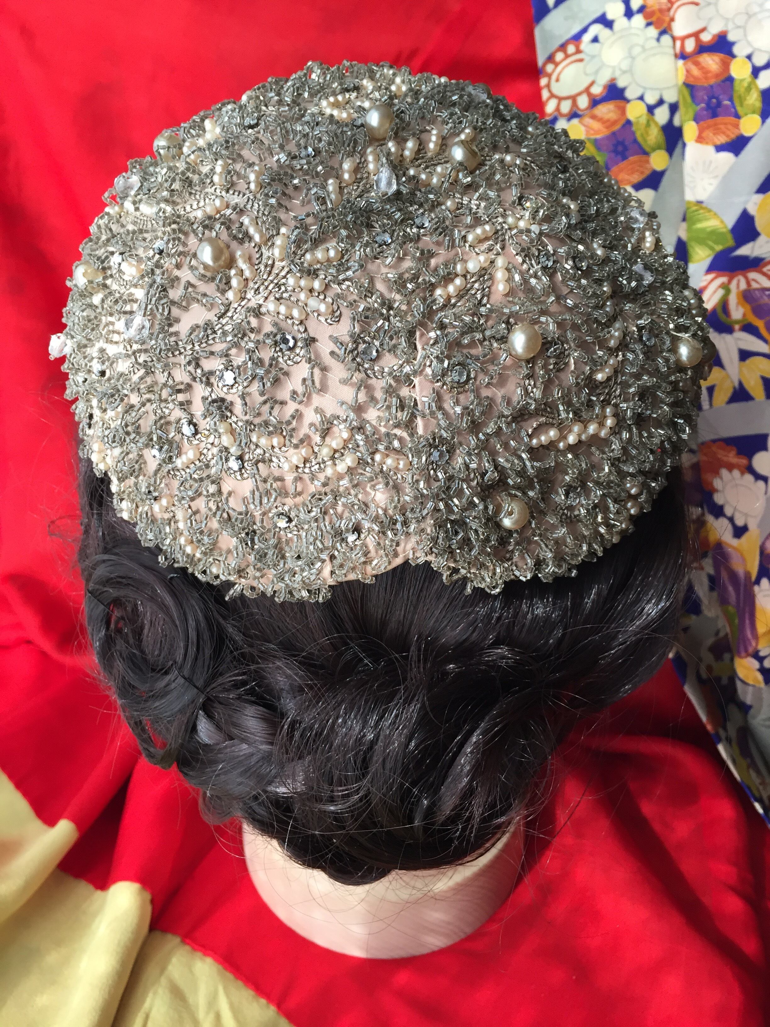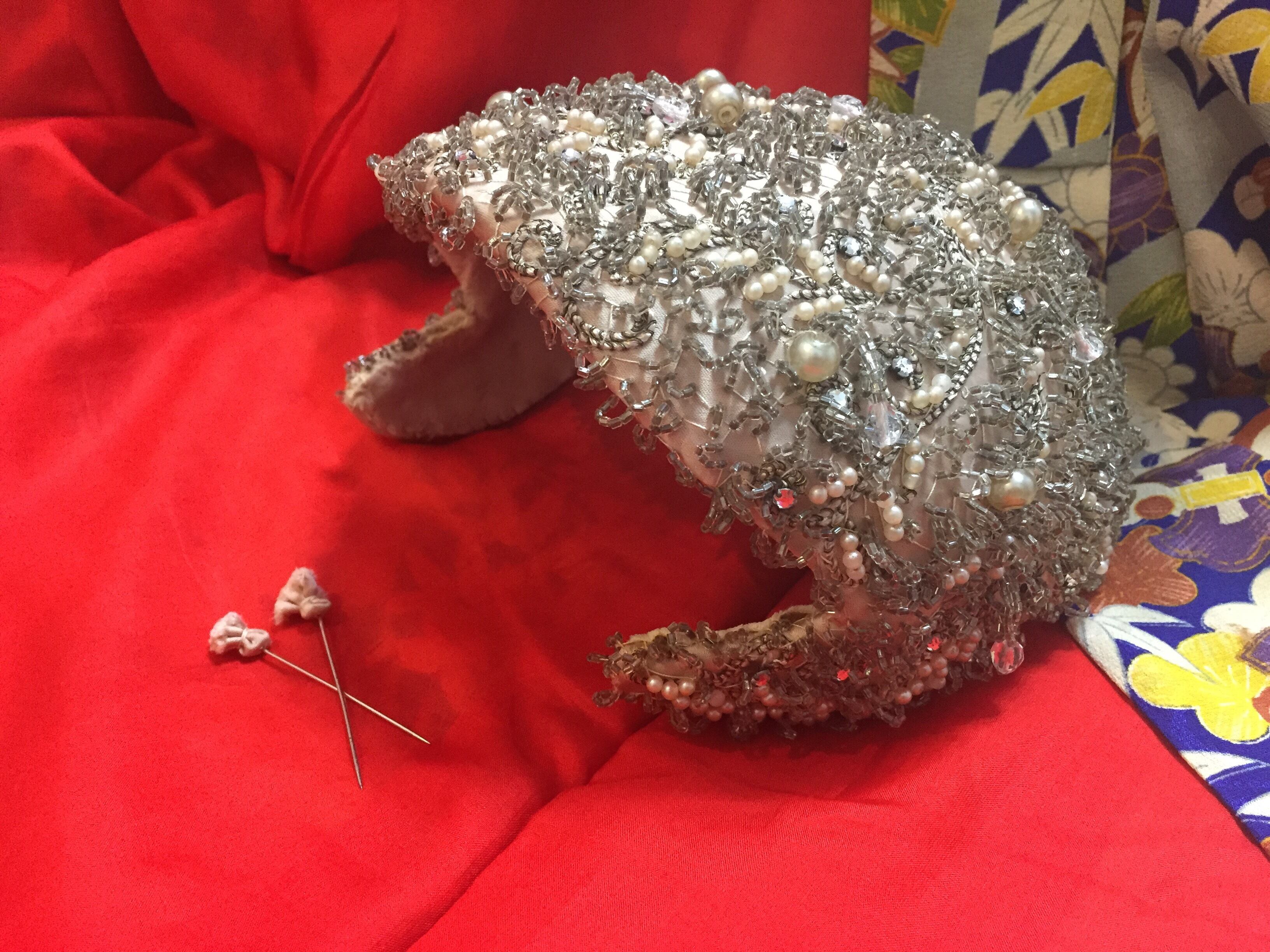 この圧巻のビーズ刺繍は、当時の素晴らしい手仕事で『カスタムメイド=特注品』だったのではないかと説明を受けています。表面の ビーズもパールもビジューも1つの欠損も無く、汚れもありません。ビジューが付いたヘッドドレスは、土台の爪が外れて欠損しているものが殆どなのですが、これは特に小さなビジューにもかかわらず1つの欠損も無いことは奇跡的です!