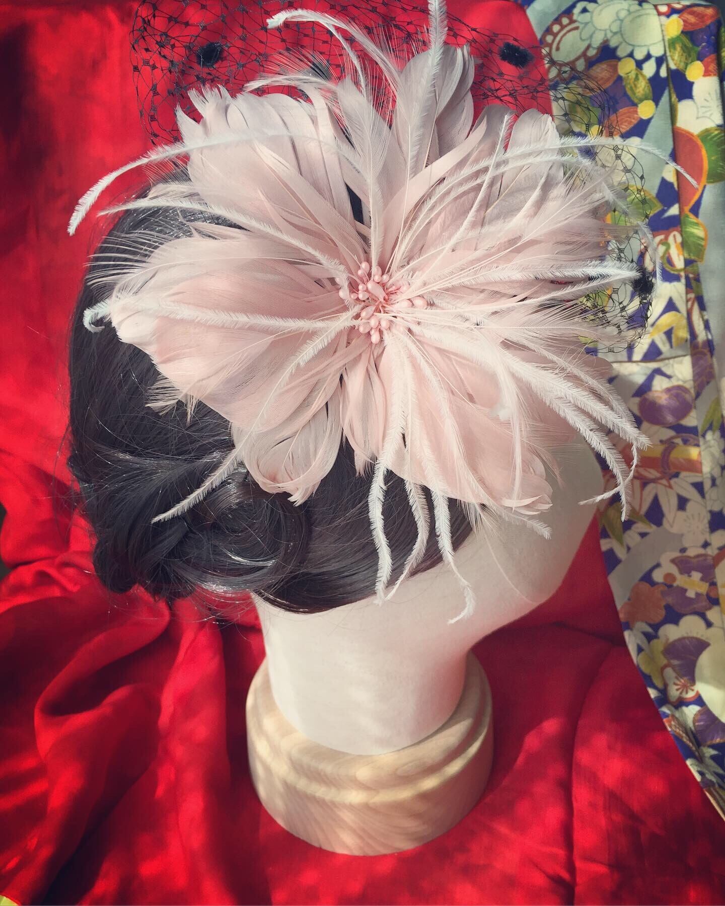 大輪のフェザーのお花が華やかな ヘッドドレス♡ピンクのお花は 3種類のフェザー使いで、とても立体的。このヘッドドレスのチュールはお顔にかけるというよりは、このように トップの方にふんわりと着用する感じです。