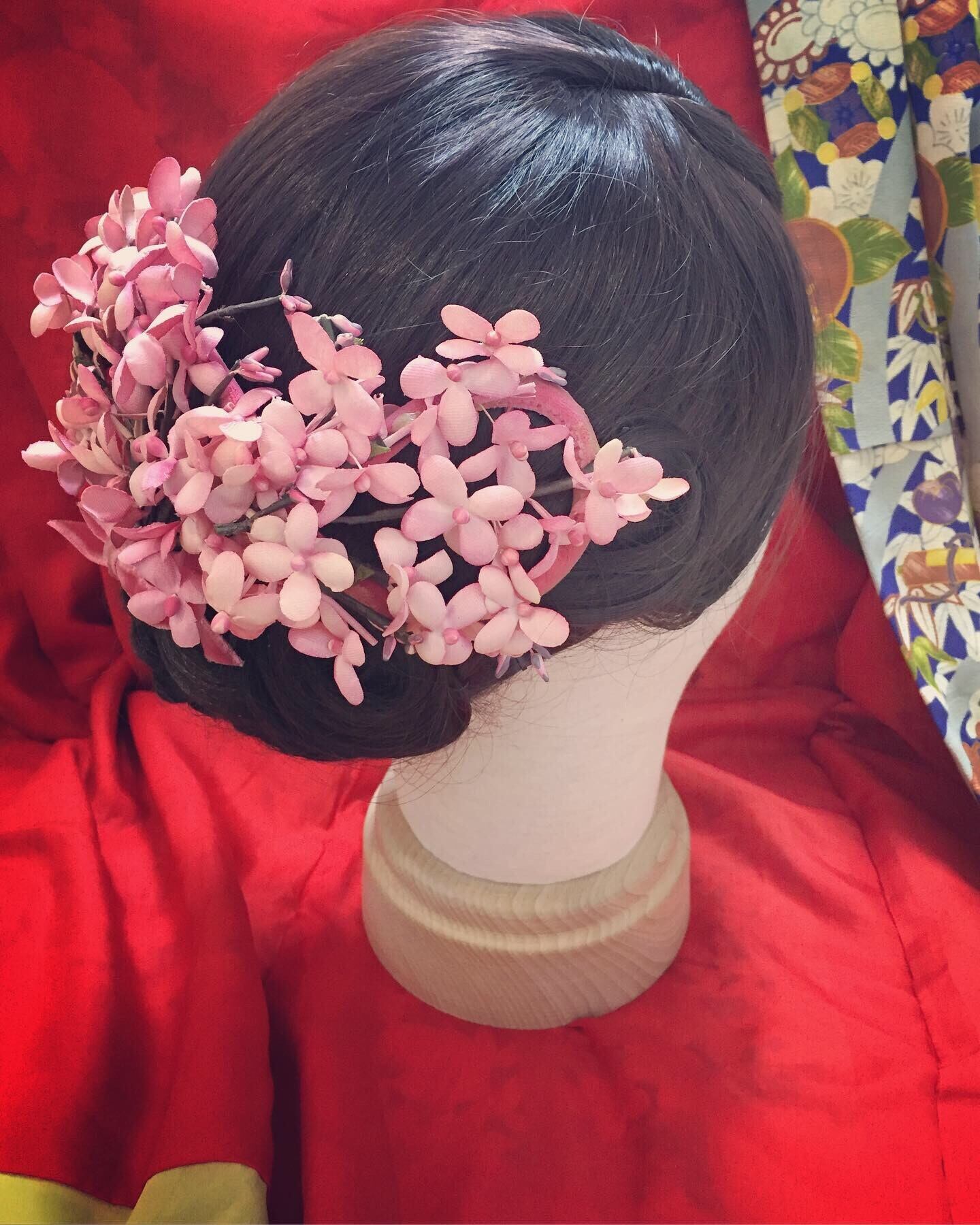 ピンクの小花が咲き誇り、小さなベルベットのリボンがちょこんと付いた『 可愛い 』の詰まったヘッドドレスです♡